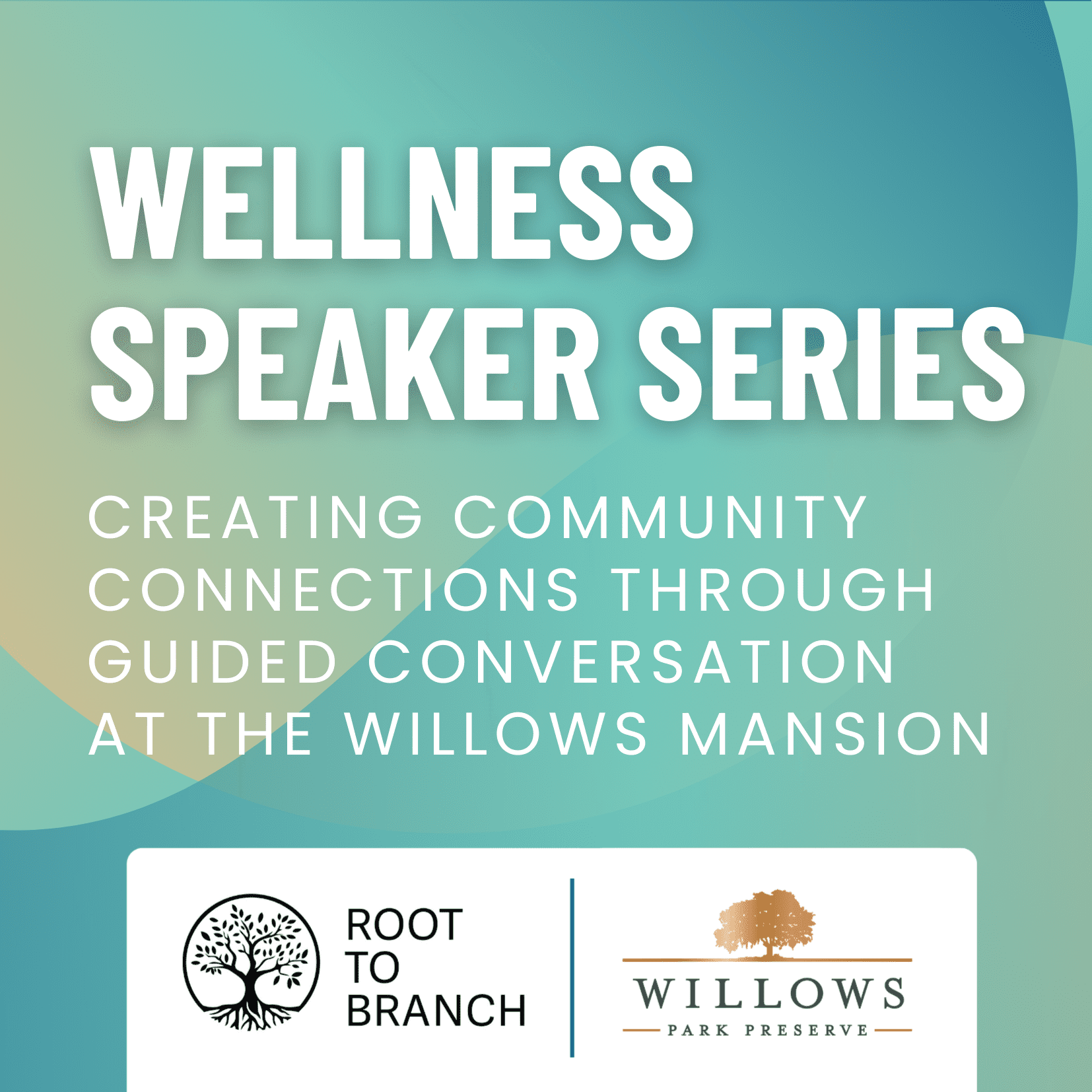 Our new monthly Wellness Speaker Series at the Willows Mansion, hosted in partnership with Root to Branch, is intended as a way to foster community connection and promote meaningful, shared “third spaces” by hosting collaborative conversations and events about topics related to mental health, wellness, healing, and other fields.
