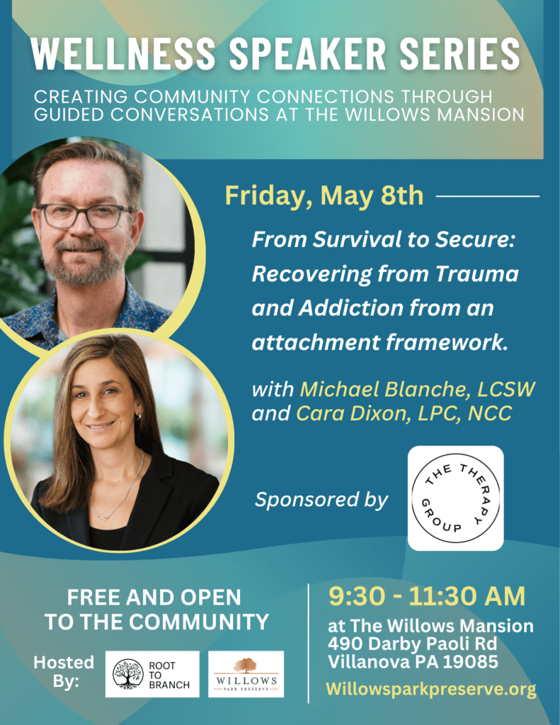 Join Michael Blanche, LCSW and Cara Dixon, LPC, NCC for another gathering in our Wellness Speaker Series, featuring interactive conversations on a variety of topics, intended to foster community connection at the Willows Mansion. Feel free to bring yourself and a question. All are welcome! There will be an optional walk on the Willows Park trail following each speaker for anyone who wishes to build in time outside and continue to cultivate well-being.